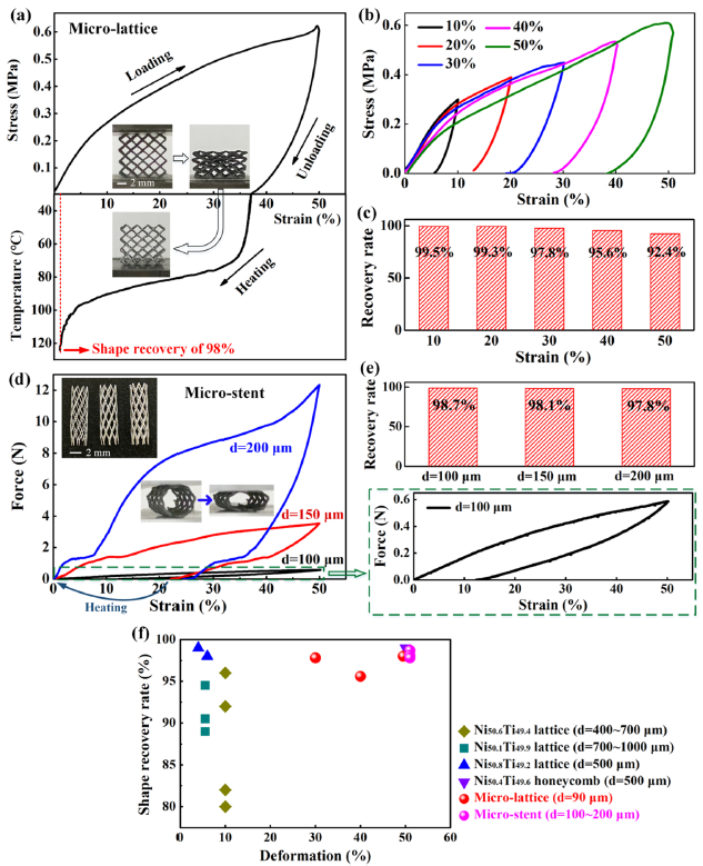 图12. μ-LPBF制备的NiTi合金微晶格和微支架的力学和形状回复功能。