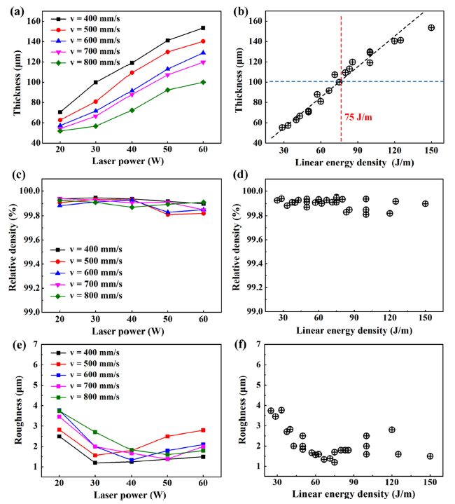 图5. 不同激光功率和扫描速率组合下的制造性能,包括成形壁厚、相对致密度、表面粗糙度。