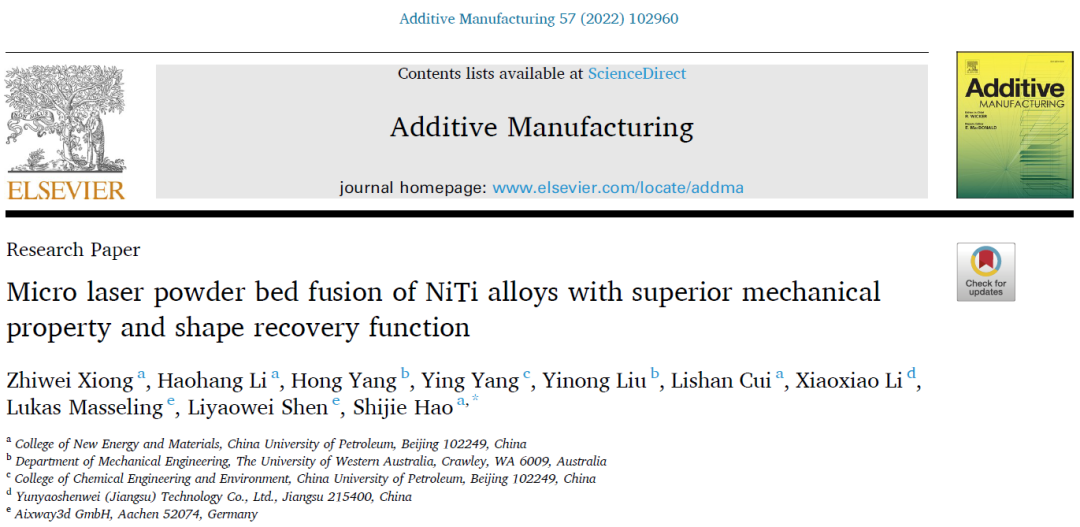 2022年6月,中国石油大学(北京)郝世杰教授团队联合西澳大学、云耀深维(江苏)科技有限公司、德国Aixway3d 有限公司在增材制造顶刊《Additive Manufacturing》上在线发表了题为《Micro laser powder bed fusion of NiTi alloys with superior mechanical property and shape recovery function》的研究文章。该文在采用小激光光斑、小粉末粒径及小铺粉层厚的基础上,通过优化组合激光功率与扫描速率,获得了兼具高致密度与低表面粗糙度的优异成形性能,并从热历史的角度分析了μ-LPBF单道扫描与常规LPBF多道重叠扫描的区别,以微器件为对象分析了μ-LPBF制备NiTi合金在制造性能、微观结构、相变行为及力学性能的综合特性,揭示了其与常规LPBF制备NiTi合金不同的特性。