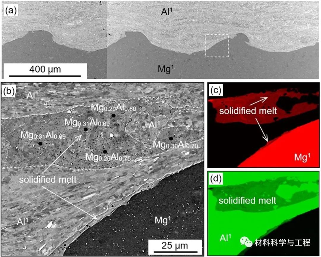 研究发现,在所施加的爆速下只有第一个界面呈波浪状,而其他界面是半平坦或平坦的。在所有界面附近,局部熔化和快速凝固形成了由各种化学成分和结构的相组成反应区域。在反应区域中发现两种平衡相(γ-Mg17Al12和β-Mg2Al3),大部分凝固的熔体由非平衡相组成,呈现出无定形或超细晶粒结构。构成反应区域的相显微硬度在358-419 ?HV范围内,约是Al的8倍和Mg的5倍。母板的界面层经历了严重的塑性变形,导致晶粒细化。多层复合材料的后续热处理诱导了高硬度γ-Mg17Al12和β-Mg2Al3层的快速形核和生长。在预先存在的反应区域内,具有各种化学成分的区域系统地转变为β-Mg2Al3相。结合区域作为β-Mg2Al3相形核中心,加速了加热过程中Mg和Al之间的反应。