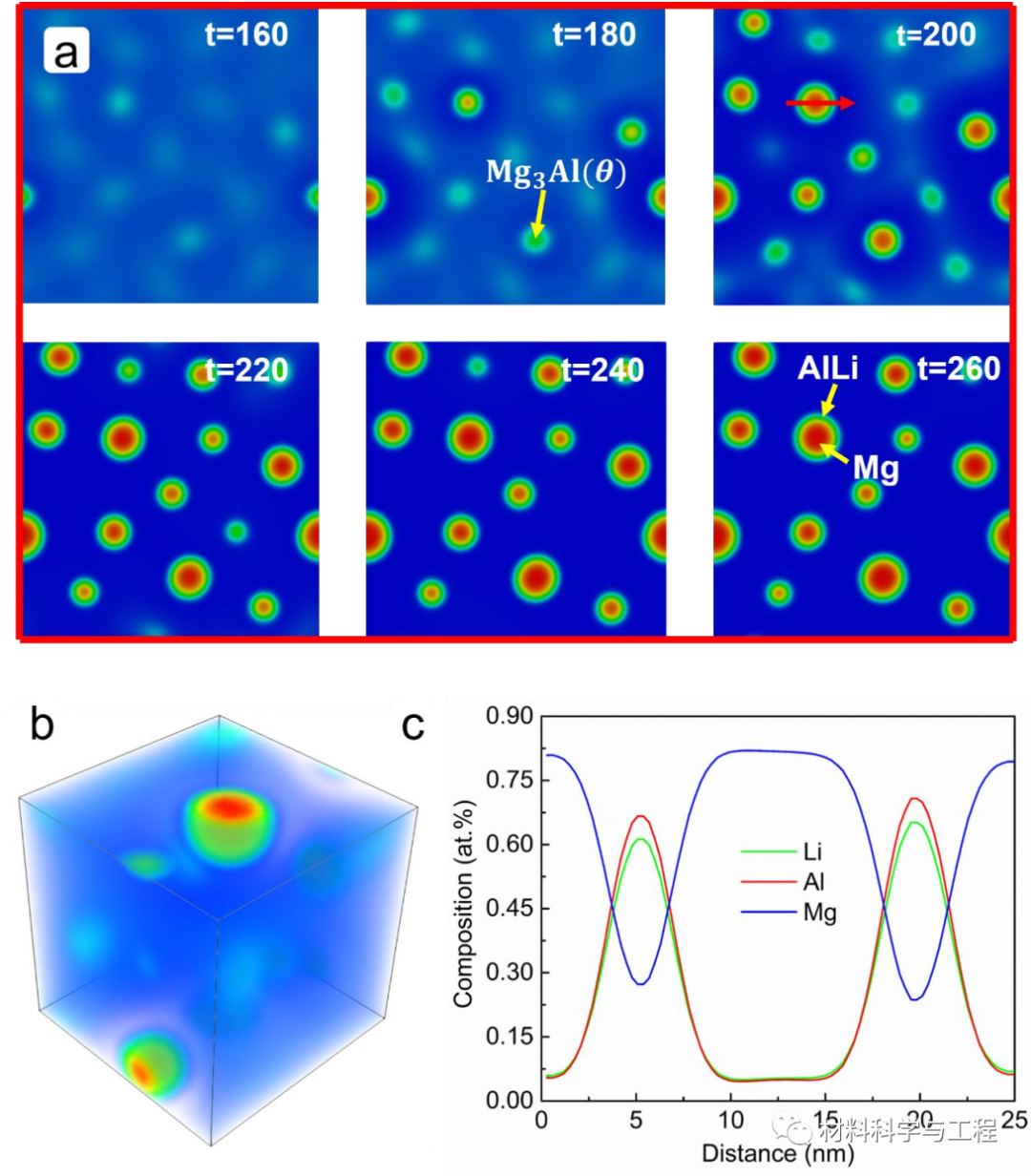 图4. 相场模拟Mg3Al→AlLi的相转变过程。(a) 275 °C等温时效下,Mg3Al→AlLi相的形貌演化,(b) 三维AlLi形貌模拟示意图,(c) 成分分布(图 (a) 中红色箭头)。