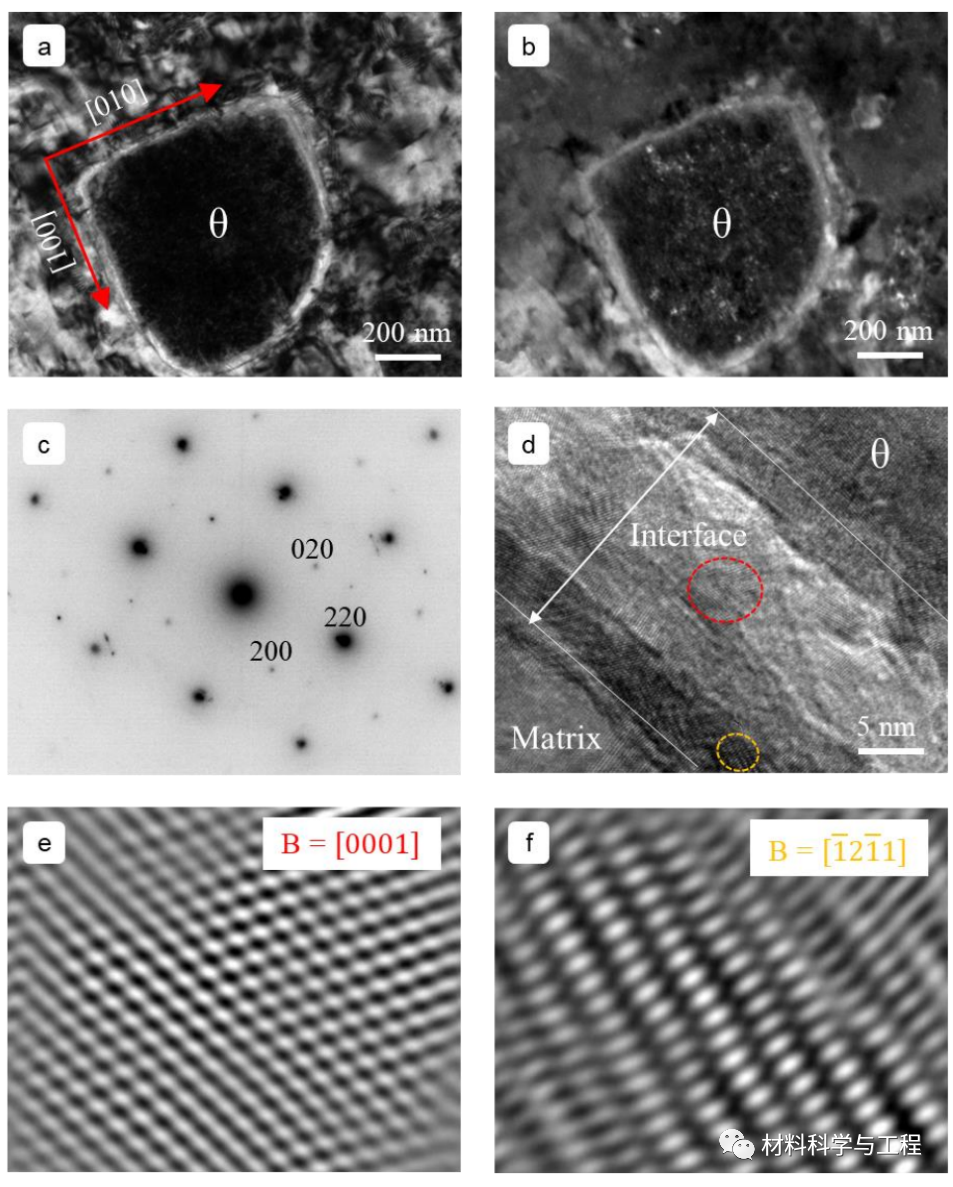 图2. θ 相和θ /基体相界面的TEM表征:θ 相的 (a) 明场,(b) 暗场,和 (c) 衍射斑点图片;(d) θ/基体界面的高分辨TEM照片以及 (e-f) 不同选区下的快速傅里叶逆转换。