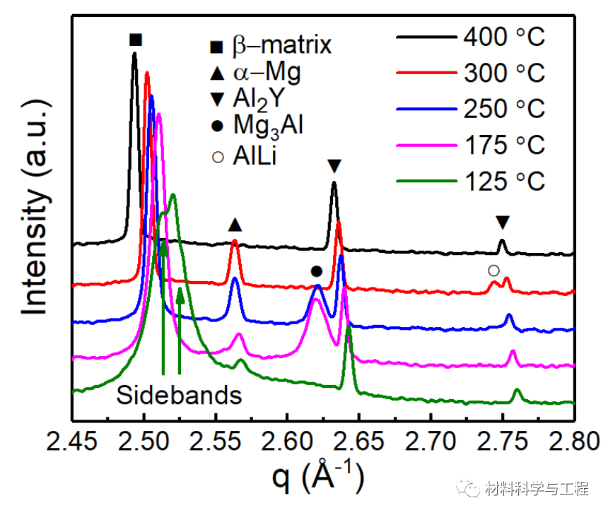 图1.原位同步XRD鉴定分析LA113合金在不同温度下等温时效所生成的各种相。