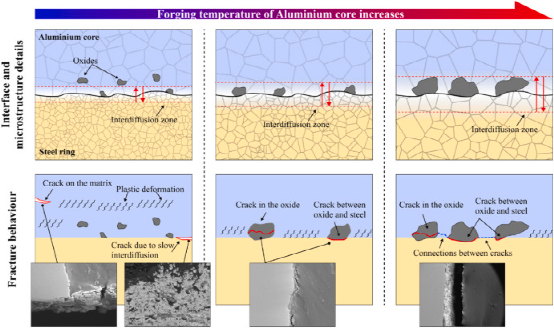 两个工件(AA6082 和 E355)之间的机械性能不匹配会影响粘合行为和微观结构演变。通过为工件设置不同的锻造温度,可以有效地调整这种失配。E355工件的氧化层在双金属锻造下因接触和塑性变形而断裂。由于界面材料流动,一些氧化物颗粒迁移到AA6082的基体中,留下无氧化物的界面区域。在 AA6082 的较低锻造温度 (300 °C) 下,在界面处观察到最少的氧化物。在三种情况下的无氧化物界面区域,EDS结果表明较高的锻造温度可以有效地促进两个工件之间的相互扩散。