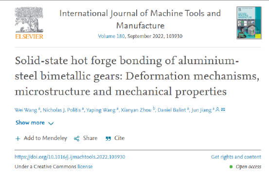 在先前的固态铝和钢粘合研究中已经观察到了微观结构特征。在铝-钢界面附近观察到等轴细晶粒。铝的平均晶粒尺寸明显小于母铝,动态再结晶发生在界面的铝侧。此外,在铝-钢界面附近观察到固溶区。这是由高温引起的相互扩散和快速冷却速率引起的。还观察到了IMC。根据 Fe-Al 图,Fe 在 Al 中的高溶解度促进了键合过程中各种形式的IMC的不同组成。有关此课题,伦敦帝国理工学院联合挪威科技大学的学者进行了深入研究,相关研究成果以题为Solid-state hot forge bonding of aluminium-steel bimetallic gears: Deformation mechanisms, microstructure and mechanical properties发表在International Journal of Machine Tools and Manufacture上。