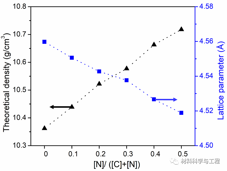 该研究以一元碳化物和一元氮化物为初始材料,通过球磨和等离子放电烧结工艺,研制了一系列新型HECxN1-x陶瓷,相对密度为98.1~99.1%。从图1所示XRD光谱可知,烧结形成了具有岩盐型结构的单相碳化物和碳氮化物固溶体。随着固溶体中氮含量的增加,XRD峰向高角度移动,表明晶格参数减少。在HECxN1-x陶瓷中,因为碳原子部分被半径较小且原子量较大的氮原子取代,所以随着氮含量增加,晶格参数逐渐降低,理论密度逐渐增大,呈现良好的近似线性关系(图2)。