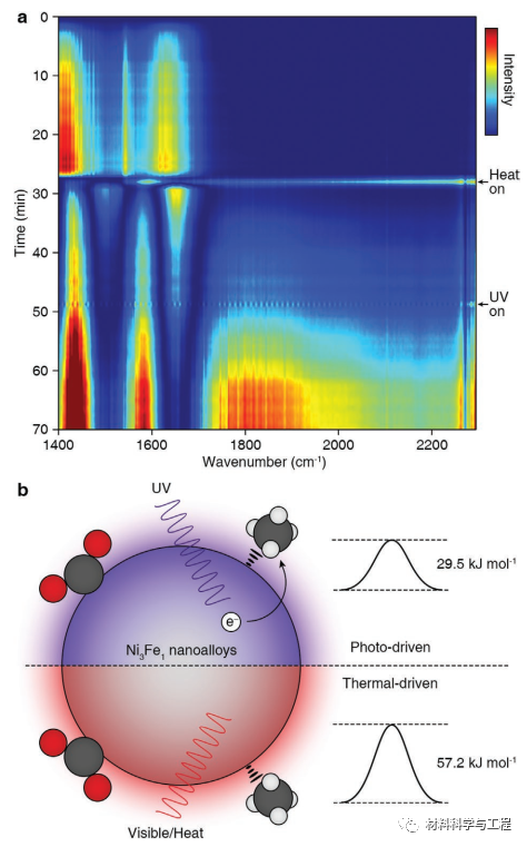 图 6.光驱动的DRM机制。a) Ni3Fe1上光驱动DRM反应的原位漂移光谱。以4 cm–1的分辨率和1分钟的时间间隔收集光谱。光谱分为上部,中部和下部,分别对应于黑暗中的室温,黑暗中的300℃和300℃的紫外线照射。颜色的深度表示从蓝色(弱)到红色(强)的特征峰的强度。b)Ni3Fe1纳米合金上光驱动DRM反应的示意图。