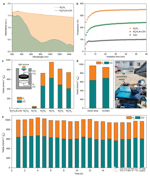 图 3.光驱动的 DRM 性能。a) Ni3Fe1催化剂和 Ni3Fe1Al-LDH 的紫外-可见-近红外吸收光谱.b)Ni3Fe1 催化剂、CaO 底物和Ni3Fe1Al-LDH 在紫外-可见光照射下的温度分布。光强度 = 3.62 W cm–2。c) Ni3Fe1Al-LDH前驱体和NixFeY催化剂光驱动DRM反应的反应装置图及CO和H2的产率。d) Ni3Fe1 催化剂在氙气灯和相同温度 (350 ℃) 下集中太阳能的 CO 和 H2 产率.图中显示了太阳光聚光系统的图片。e) Ni3Fe1在紫外光照射(0.18 MPa,75 mL min–1,CH4/CO2/Ar = 25/25/50)下的稳定性测试。