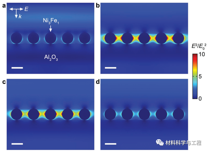 图 5.模拟电液相增强的空间分布。Ni3Fe1 在 a) 230 nm 波长、b) 330 nm波长、c) 430 nm 波长和 d) 530 nm 波长。