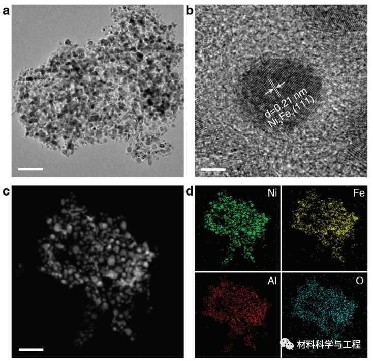 图1.Ni3Fe1催化剂的形态表征。a)透射电子显微镜图像。b)HRTEM图像。c)HAADF-STEM图像。d)Ni、Fe、Al和O的叠加EDX元素图和单独的EDX图。