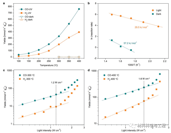 图 4.光热协同效应研究.a) 在黑暗和光明条件下,Ni3Fe1 在不同温度下的 CO 和 H2 产量。b) Ni3Fe1在明暗条件下的反应活化能。c) Ni3Fe1在300℃和不同光强下对DRM的催化性能。d) Ni3Fe1在400 ℃和不同光强下对DRM的催化性能。