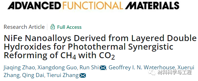 来自中国科学院物理化学技术研究所的学者以NiFeAl层状双氢氧化物为前驱体,合成了一系列氧化铝负载的NixFeY纳米合金,并将其用于光热协同DRM。在350℃的光热条件下,Ni3Fe1纳米合金催化剂的合成气产率为0.96 molg-1h-1,约为相同温度下暗条件下合成气产率的1100倍。Ni3Fe1纳米合金在紫外区的局域表面等离子体共振大大增强了作为DRM反应速率决定步骤的甲烷活化,从而显著降低了反应温度。同时,基于纳米合金的光热协同DRM具有太阳光驱动的可行性和20h的连续运行稳定性。相关文章以“NiFe Nanoalloys Derived from Layered Double Hydroxides for Photothermal Synergistic Reforming of CH4 with CO2”标题发表在Advanced Functional Materials。