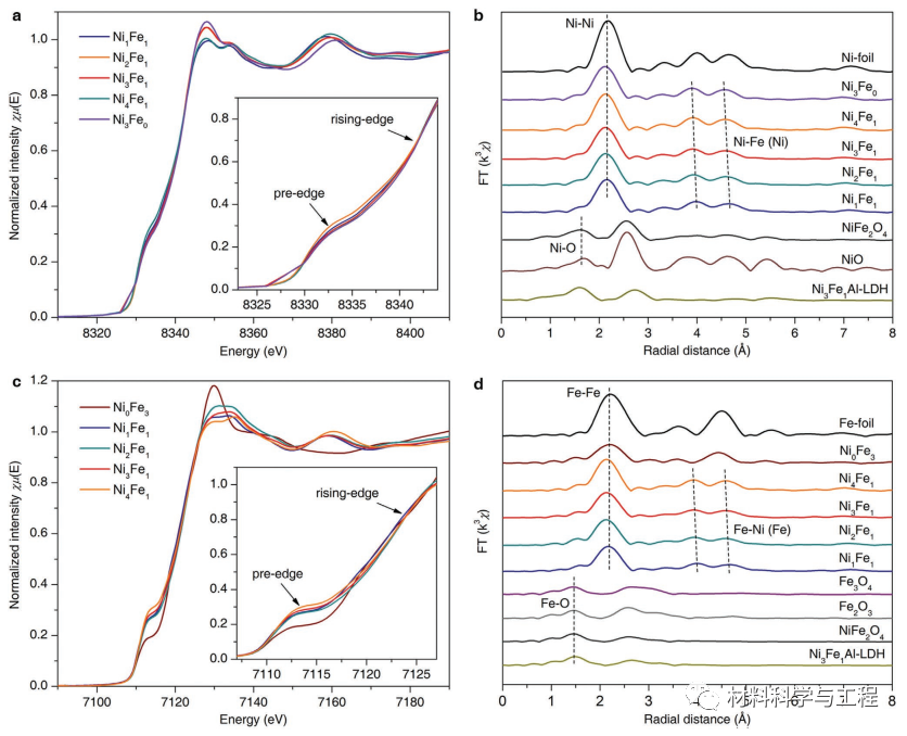 图 2.催化剂的配位环境分析。a) Ni K-edge XANES 和b) NixFeY 催化剂、Ni3Fe1 Al-LDH 前驱体和NiFe2O4 对照样品的 EXAFS 光谱.c) 铁 K-edge XANES 和d) NixFeY 催化剂、Ni3Fe1Al-LDH 前驱体和 NiFe2O4对照样品的 EXAFS 光谱.