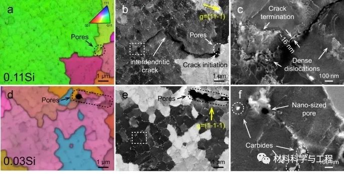 图3 含气孔的0.11Si和0.03Si样品的可控电子通道对比成像(cECCI)图像。
