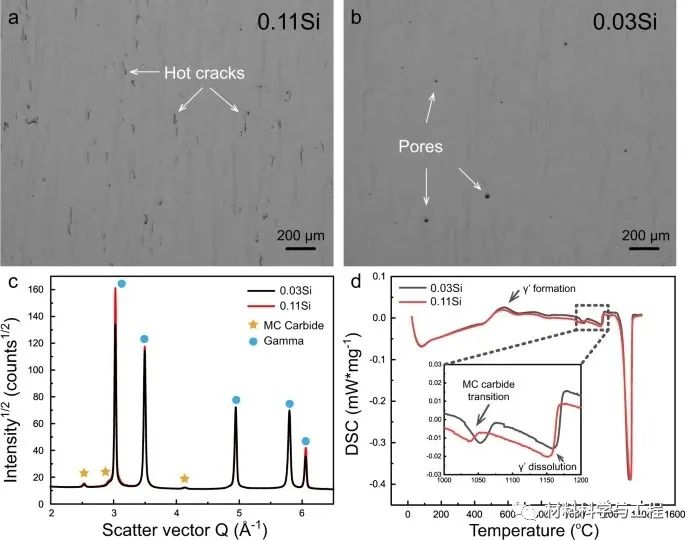 图8 通过工艺优化和成分调整,使0.11Si合金的热裂纹最小。