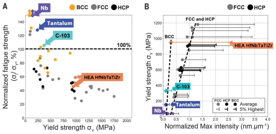 我们的数据表明,与FCC和HCP金属相比,BCC金属倾向于以更均匀的空间方式分布应变。纯Nb、纯钽,合金在单调加载过程中产生较低的平均滑移强度。因此,它们表现出非常高的疲劳效率,在某些情况下显示出高于屈服强度的疲劳强度。HfNbTaTiZr的特殊例子是一个有趣的例外,因为它显示了最高强度的滑移定位。这种合金中最强烈的滑移痕迹与抑制交叉滑移的特殊晶体取向有关。这些结果表明,对这类合金的晶体织构的控制可能是获得优异性能的关键。对导致高屈服强度BCC合金强烈局部化的位错机制的深入物理理解也可能为这类材料中的合金设计提供指导。