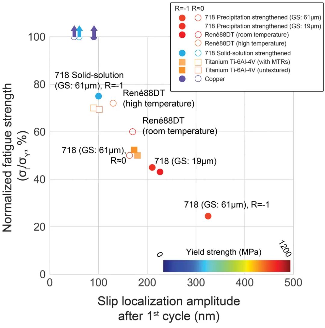 在高或非常高的循环疲劳状态下的疲劳强度与金属材料的固有力学性能之间的相关性,包括屈服强度、极限抗拉强度和硬度,在文献中得到了广泛的报道。最有趣的是观察到疲劳强度随着屈服强度或极限抗拉强度的增加而增加。然而,绘制归一化疲劳强度与金属屈服强度或极限抗拉强度(图1)显示,在许多情况下,具有高强度的金属材料在应力低至屈服强度的25%时因疲劳而失效,表明疲劳效率明显较低。在微观结构尺度上连接拉伸、屈服强度和疲劳强度的物理过程和参数尚未完全了解。此外,为什么拉伸强度高的金属和合金具有如此低的疲劳效率也不清楚。大量的疲劳建模工作,使本构模型与大量的疲劳试验数据相匹配。