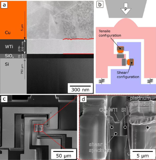 试样被安装在该装置上,以促进Cu和WTi之间界面的拉伸或剪切载荷,如图1(b)所示。在将试样操纵到铂金沉积的标高上,并用厚厚的铂金层固定,以减少接触顺应性,随后在芯片上进行塑形和减薄步骤,加速电压和电流不断降低,在5keV下最小为16 pA,导致电子透明箔,以后分别用于微结构调查或微机械测试。机械测试前的剪切试样的最终形状显示在图1(c)和(d)。