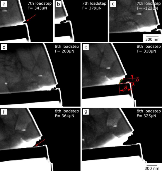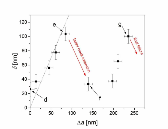 裂缝尖端开口位移δ相对于裂缝扩展Δa。d-g的位置对应于图7中的HR ADF图像,虚线代表ASTM 1820建议的1.4的斜率