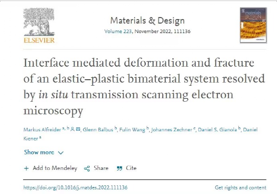 相关研究成果以题“Interface mediated deformation and fracture of an elastic-plastic bimaterial system resolved by in situ transmission scanning electron microscopy”发表在国际著名期刊Materials & Design上。