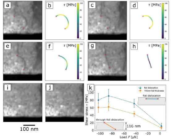 经过傅里叶过滤的HR BF图像和局部剪应力作为单一位错弓出的曲率函数,在载荷增加时:(a, b)-104μN,(c, d)-87μN,(e, f)-44μN,(g, h)3μN和(i, j)49μN,其中(j)是相应的未经过滤的图像,显示机械振动。(k)计算出的位错平行于图像平面(蓝色,向上指向的三角形)或倾斜的位错穿过116纳米厚的箔片(橙色,向下指向的三角形)时的剪切应力超过载荷。微米条适用于图像(a-j),色条描述了剪应力,单位为兆帕。