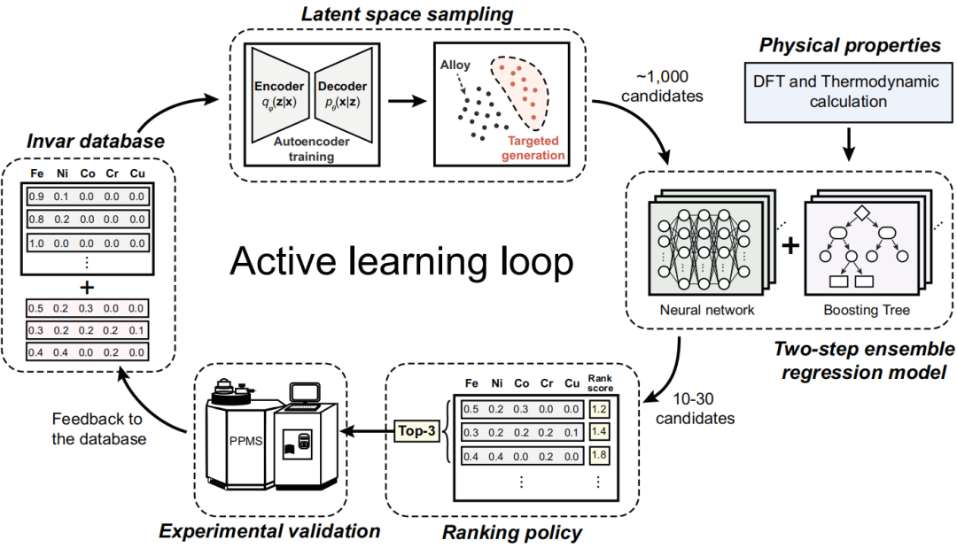 图 1. 基于主动学习的高熵合金设计框架。此框架集成了机器学习模型、第一性原理计算、热力学模拟和实验。首先,该框架生成新的合金成分,由两个主要步骤组成:i) 用于成分生成的自动编码器。ii) 用于成分选择的随机抽样。其次,该框架进一步对成分进行处理,包括两个由多层感知器和梯度提升决策树组成的集成模型。在最后一步,通过基于排名的策略选择最有希望的合金组合。排名前三的合金成分通过实验测量并反馈到数据库。重复迭代,直到发现性能达到预期标准的因瓦合金。