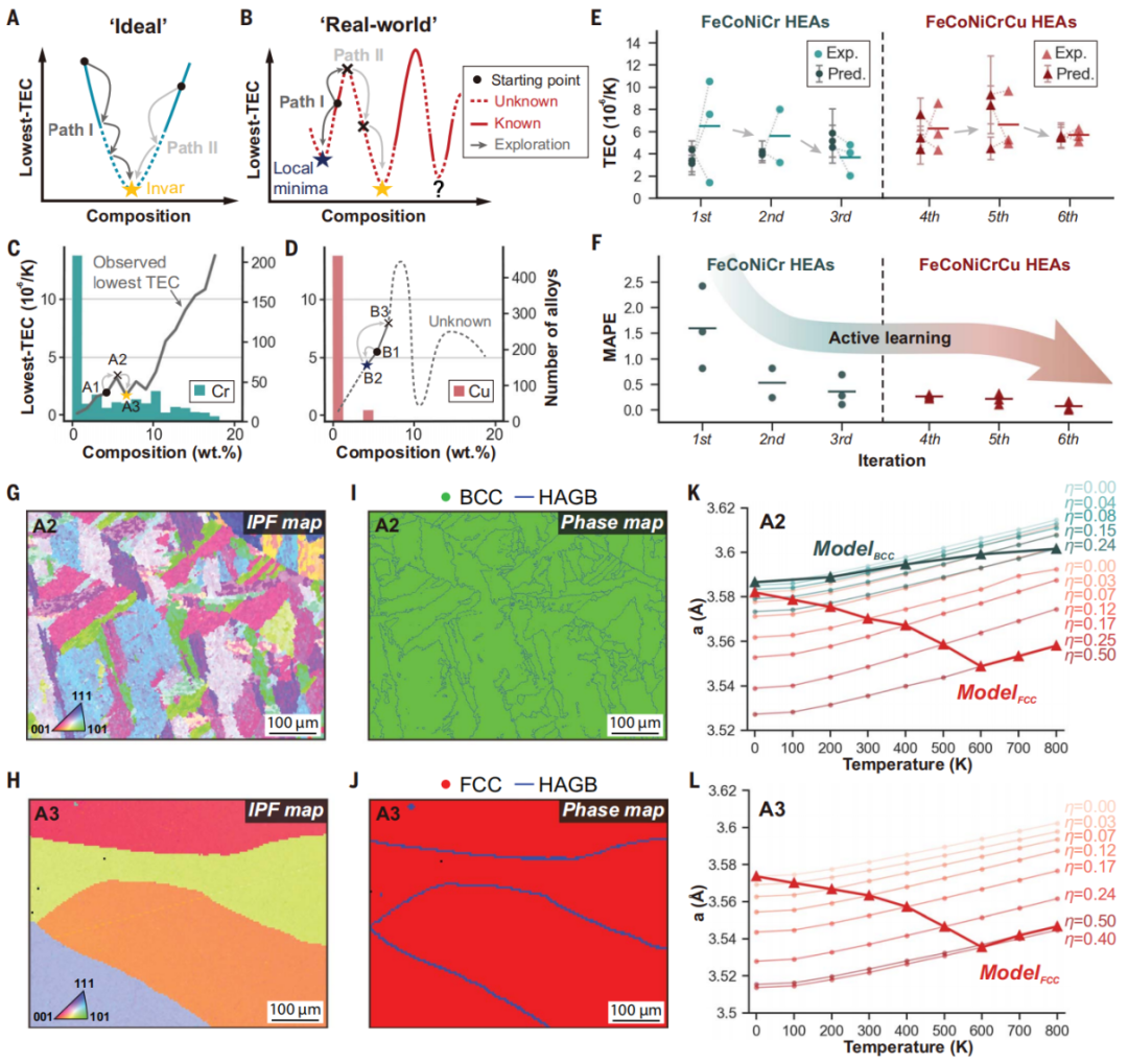 图 2. 主动学习循环中 6 次迭代后的结果分析。 (A) 和 (B) 合金发现过程在理想和现实世界中的对比。 (C) 和 (D) Cr 和 Cu 元素在数据集中的分布直方图。Cr 直方图具有各种浓度(从 0 到 20%)。相比之下,绝大多数(超过 95%)的组合物的铜浓度为零。作为组成变化的最低已知热膨胀系数绘制为实线,而虚线表示未知数。灰色箭头说明了 HEA-GAD-TERM 的发现路径。 (E) FeNiCoCr 和 FeNiCoCrCu高熵合金的预测和实验热膨胀系数。 (F) 主动学习的误差变化图。误差的减小来自于自然的学习过程。 (G) 和 (I) A2 合金的 EBSD 相分布和晶界分布图。 (H) 和 (J) A3 合金的 EBSD 相分布和晶界分布图。 (K) 和 (L) A2 合金中晶格常数随温度的变化。