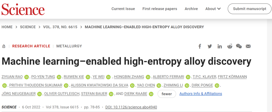 针对这个问题,近日德国马普所钢铁研究所的研究人员与多个研究团队合作,提出了一种新的基于机器学习的高熵合金设计方法,极大地提高了高熵合金的设计效率,并成功地设计了多种新型高熵因瓦合金。马普钢铁研究所饶梓元博士为第一作者,韦业博士和Dierk Raabe教授为共同通讯作者。共同合作单位和合作人包括英国剑桥大学童博彦博士,瑞典皇家理工学院Stafan Bauer教授,德国达姆斯塔特工业大学张洪彬教授、谢瑞文博士,中国东南大学陈耀教授和中南大学李志明教授等。