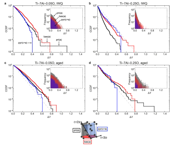 帝国理工学院材料学院团队与美国宾夕法尼亚州立大学、美国Lawrence Livermore国家实验室和Rolls-Royce材料研发部门合作,从蠕变实验、材料表征和理论机理等两个角度,揭示了Ti-7Al-O合金在不同热处理和氧原子含量等合金条件下的间歇性滑移以及应力波动受其影响情况,印证了钛合金在微观尺度上的失效机理。该研究使用透射电镜(TEM)和高能X射线衍射电子显微镜,分别对Ti-7Al-O合金在不同沉积相Ti3Al和氧原子含量下的位错结构和应力水平进行检验。结合局部微观组织结构,揭示了有序沉积相Ti3Al会同时提高钛合金不同滑移系的间歇性,从而不利于其保载疲劳寿命。相反,适当提高氧原子含量能够降低间歇性滑移的幅度,从而有利于钛合金的保载寿命。