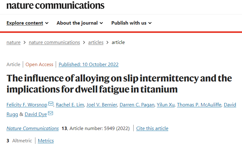 该研究在本课题组之前研究基础上(http://doi.org/10.1038/s41467-020-19470-w)填补了对钛基合金疲劳机理在瞬时尺度上的理解空白,从微观力学角度为离散位错动力学研究提供了新的研究驱动力,为航空发动机寿命的定量分析赋能,对航空发动机的寿命、可靠性和性能改善有着重要意义。该研究工作由英国皇家工程院院士David Rugg教授,钛合金顶尖专家David Dye教授、微观力学模拟学者徐轶伦博士、材料表征专家Felicity F. Worsnop博士、Rachel E. Lim博士、 Joel V. Bernier博士, Darren C. Pagan博士, Thomas P. McAuliffe博士等共同完成。该研究部分成果发表在国际顶级综合性期刊、《自然》子刊《自然·通讯》Nature Communications上,其中Felicity F. Worsnop博士为第一作者。
