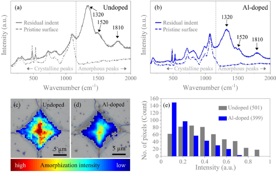 从(a)未掺杂和(b)掺杂的碳化硼的原始和缩进的碳化硼中获得的拉曼光谱。(c)未掺杂和(d)Al掺杂碳化硼的无晶态化强度热图覆盖维氏压痕的光学图像。由于掺杂,集成像素强度显示总非晶化强度降低了44%。每个像素为 0.5 × 0.5 μm,每个映射为 20 × 20 μm。热成像图由 5 个独立结果构成。(e) 按强度排列的像素直方图。