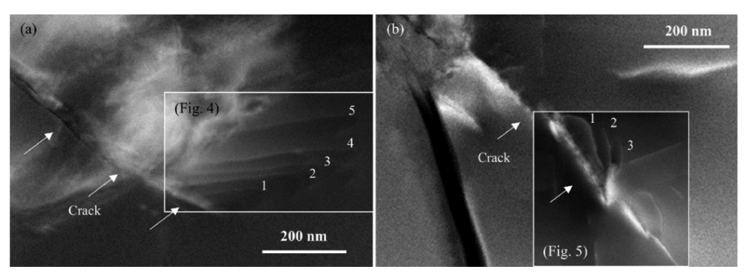 (a)和(b)说明了两个不同的Al掺杂碳化硼试样中从裂纹尖端发出的位错的低角度环形暗场扫描透射电子显微镜(LAADF-STEM)图像的复合图像。裂缝用箭头标记,错位编号。