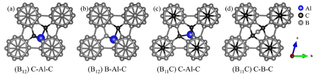 铝掺杂碳化硼的三种合理构型:(a)(B12C-阿尔-C,(b)(B)12B-阿尔-C,(b)(B11(C) C.形成能量分别为-1.28,-0.816和-0.236 eV。(d)描绘了最常见的未掺杂碳化硼(B11C) C-B-C。