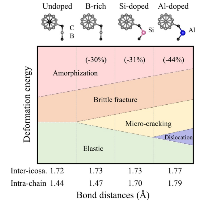 示意图显示了各种碳化硼固溶体系的变形机理领域。据报道,微裂解会消耗富B和Si掺杂碳化硼中的应变能,导致非晶态化减少30-31%。掺杂可激活位错运动和微开裂以消散变形能,从而进一步抑制非晶化(44%)。