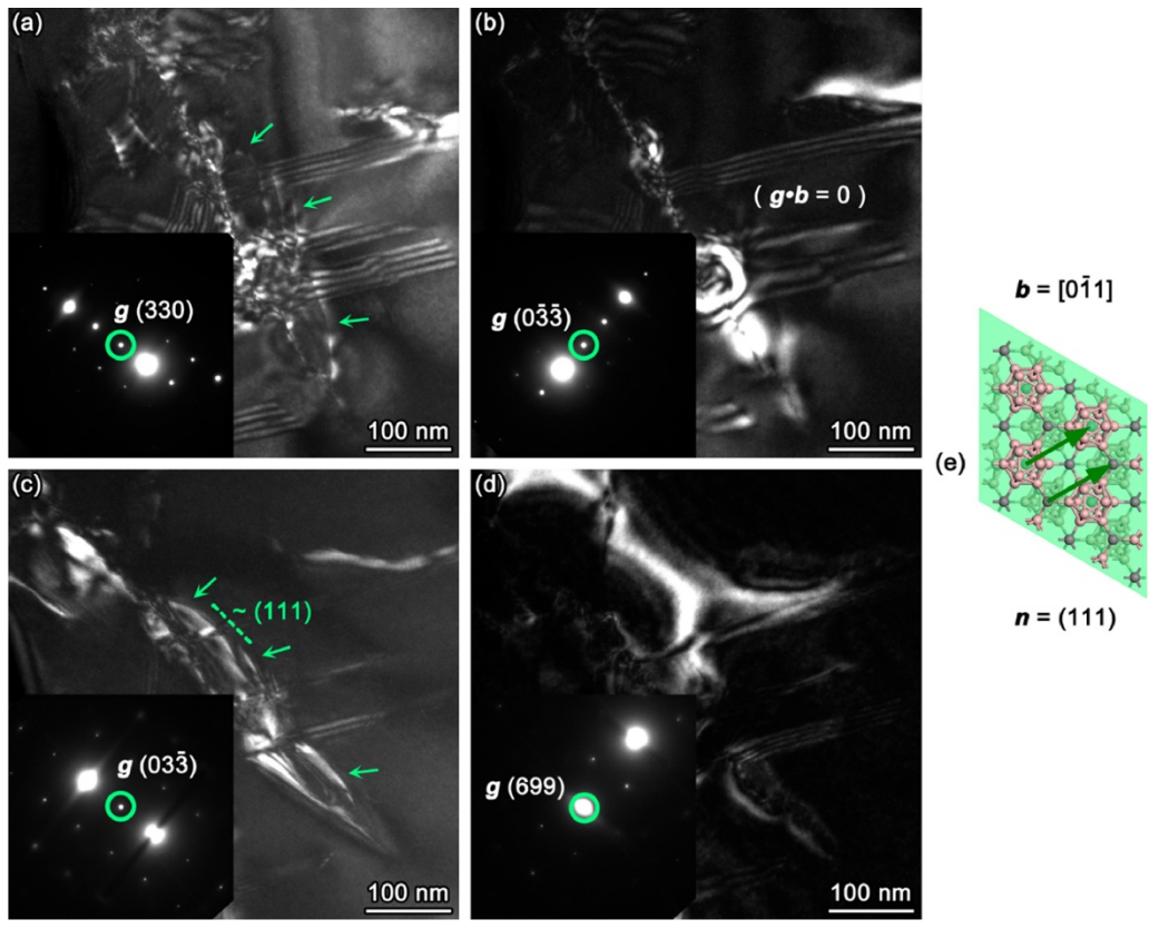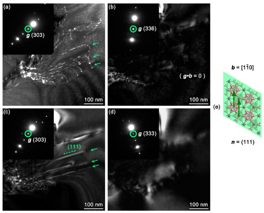 图3(d)中位错的详细分析。从两个方向看,位错是可见的(标记为箭头):(a)倾斜到滑移平面,(c)更接近滑移平面;在 (b) 和 (d) 中,位错是不可见的,因为g•b = 0。插图衍射图案表示施加的反射(g)。成像条件为:(a)、(b)的WBDF近似值(g,3 g);(c)的近似(g,2g)WBDF;2DF用于(d)。已识别的滑移系统的原子模型如(e)所示。