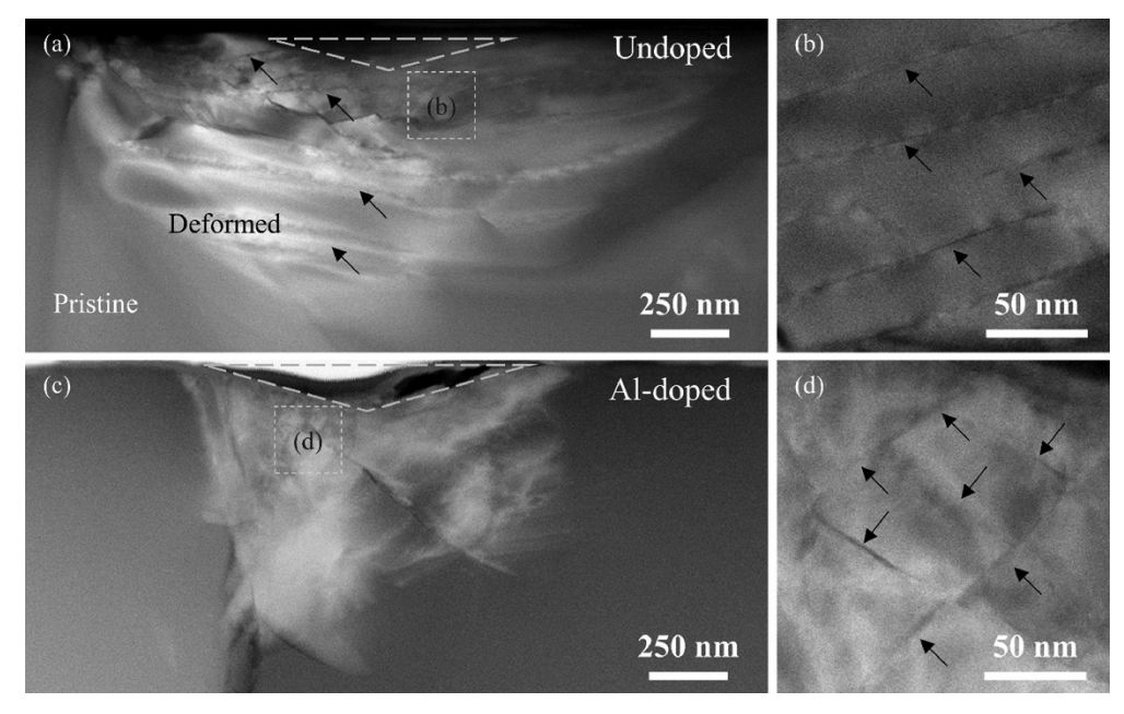 低角度环形暗场扫描透射电子显微镜(LAADF-STEM)在(a)未掺杂和(c)铝掺杂碳化硼的Berkovich压痕(由虚线三角形标记)下的变形区的图像。在未掺杂的碳化硼中可以看到长而近平行的剪切断层。(b)未熔化碳化硼的高分辨率图像描绘了长而平行的剪切断层,而(d)掺杂的碳化硼表现出扩散的微裂纹。