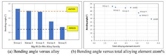 Mg-Al-Mn-Zn合金家族与AM合金的平均弯曲角。