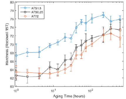 T4热处理(420℃/10小时)ATS和AT72 HPDC的老化曲线 试样在200℃下的老化曲线(Copyright 2016 by The Minerals, Metals & 材料协会版权所有,经许可使用)。