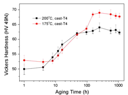 T4热处理的AT72 HPDC试样的老化曲线。175℃和200℃下的老化曲线 (Copyright 2013 by The Minerals, 金属与材料协会版权所有,经许可使用)。
