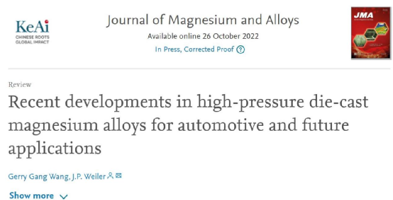 相关研究成果以题“Recent developments in high-pressure die-cast magnesium alloys for automotive and future applications”发表在国际著名期刊Journal of Magnesium and Alloys上。
