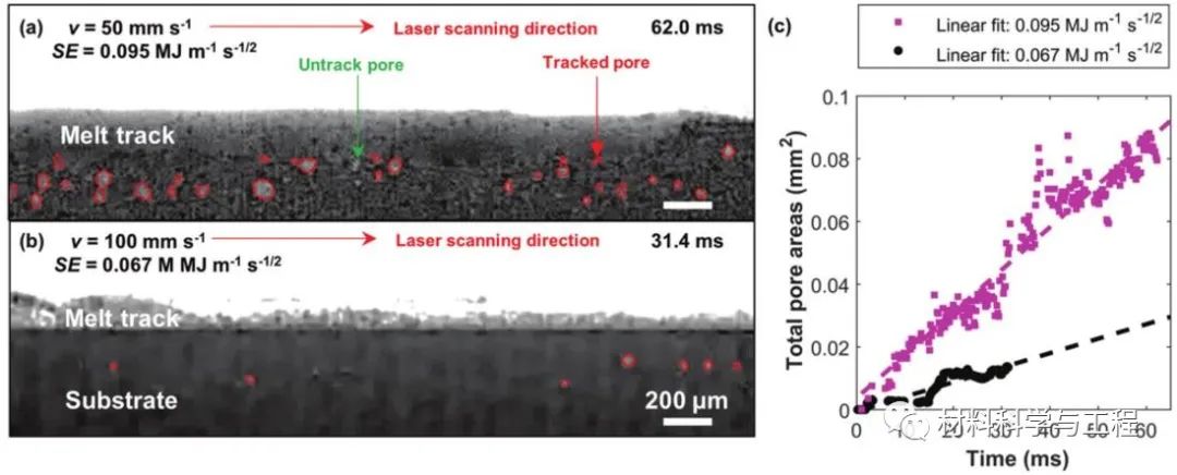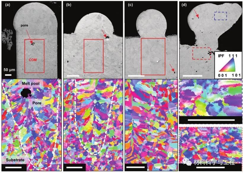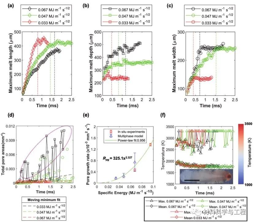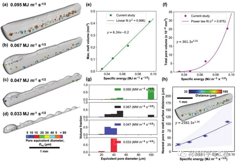 研究表明,孔隙和微孔形成的现象是由锁孔中的高温温度和高金属蒸气浓度驱动。不规则孔隙通过小孔塌陷、孔隙合并和随后的凝固前沿捕获形成。深入的研究表明,快速移动的蒸气羽流和熔池混合体作用导致开尔文–亥姆霍兹(Kelvin–Helmholtz)熔道表面不稳定,最终形成熔道隆起。在本项研究中,研究人员利用同步辐射X射线高速成像和高保真物理模型定量化分析了粉末激光单层扫描条件下的孔隙演化动力学、孔径分布、波纹度、表面粗糙度和熔体体积变化规律,为LPBF中缺陷的形成机理以及工艺优化提供了研究基础。图1 时间序列射线照片显示了Inconel 625合金LPBF期间熔道和孔隙的形成(P=150 W,v=50 mm s−1,t=100μm,d=50μm,SE=0.095 MJ m−1s−1/2 ) :a) 图片背景消減 (BGS) 前的射线照片,其中浅灰色、中灰色和深黑色分別显示了氩气/背景、Inconel 625 粉末和基材。红色箭头表示扫描激光束方向,蓝色箭头表示氩气流动方向,黃色虚线表示熔化区域。选定的 BGS图像揭示了 b) 2、c) 19.6 和 d) 62.7 ms处的孔隙形成现象以及感兴趣的区域。放大图像 (e–h)显示不规则孔隙的形成,其中 f) 展示了由于Marangoni对流卷入的气孔,g) 显示了卷入气孔与预先存在孔隙的合并,h)显示了凝固后的气孔形状和位置。图中比例尺为 100 µm。请详细参阅支撑附件中动画 S1获取更多细节。图2 Inconel 625 合金LPBF期间的二维微孔面积定量化演变结果: 在 a) 0.095 和 b) 0.067 MJ m−1 s−1/2 比能量(SE)条件下覆盖有跟踪孔(红色)的示例性射线照片; c)实验 (a) 和 (b) 的孔隙面积分析;数据最佳拟合方程分别为:y = 1.359 × 10−3x − 3.803 × 10−3 (r2= 0.829, p-value = 0.0005) 和 y = 4.63 × 10−4x − 4.999 × 10−4 (r2= 0.925) , p 值 = 0.0014)。比例尺 200 µm。气孔跟踪视频可在支撑附件材料动画 S2 和 S3中获取。图3多相模拟结果显示了Inconel 625 合金LPBF期间的熔池和缺陷动力学演变过程:在LPBF开始时,a)发生激光钻孔并在汽化凹陷区(VPZ)形成匙孔; b) 由于金属蒸汽的冷却和凝结导致的孔隙收缩,参见孔隙演化事件(插图); c) LPBF过程中的I-J匙孔转变,其中匙孔腔主要包含氩气; d) 由于金属蒸汽和氩气混合引起的匙孔不稳定性导致的匙孔形成; e)显示了隨着比能量SE 的降低导致孔隙率和匙孔深度的降低。所有比例尺均为 100 µm。请参阅支撑附件材料中视频 S4–S6获取详细信息。图4使用高保真多相模拟结果揭示的随比能量(specific energy,SE)和时间变化的(a-c)熔池几何形状、(d-e)微孔生长速率和(f)表面温度的定量化演变结果。 a) 长度、b) 深度和 c) 熔池几何形狀的宽度随时间的量化关系,其中 (a–c) 中的垂直虚线显示熔池几何形状达到稳定状态的时间。 d) 隨时间量化的孔隙面积,图中显示了基于移动最小值拟合线性回归线。洋红色圆圈为LPBF过程期间形成的大量孔隙; e) 从模拟和(d)实验数据(图 2c)中提取的孔隙增长率(r2 = 0.956,p 值 = 0.00146),f) 显示最大和平均熔池温度,其中 3300 K 是液态合金的最大温度;比例尺为250 µm。图5 Inconel 625合金熔体轨迹中随比能量(specific energy,SE)变化的熔体体积和孔隙体积分析的三维定量化结果。在a)0.095、b)0.067、c)0.047和d)0.033 MJ m−1s−1/2的比能量SE条件下形成的带有内部空隙的三维熔道。灰色代表熔体体积,彩色对应于孔体积当量等效直径 Deq。量化结果分析: e) 熔体体积(r2 = 0.996,p 值 = 0.0022),f)孔体积(r2 = 0.975,p 值 = 0.00128),g)孔径分布,和 h)最近的孔到熔体表面距离图(r2 = 0.975,p 值 = 0.00125)。图 (h) 使用标准误差棒,蓝色阴影区域覆盖和最大测量值。实心圆圈和正方形标记分別表示最大和最小孔至熔体表面最近距离。插图显示熔道 (a)中与孔重叠,并带有孔至熔体表面最近距离的色图。图6 随比能量(specific energy,SE)变化的Inconel 625合金熔道的拓扑形貌分析。a) 熔道轮廓、b)波纹度(r2 = 0.991,p 值 = 0.00465)和 c)表面粗糙度(r2 = 0.997,p 值 = 0.00167)随比能量 SE 的函数绘制图。图7 在不同比能量(specific energy,SE)作用下的Inconel 625熔道的背散射电子组织图像:(a)0.095、(b)0.067、(c)0.047和 (d)0.033 MJ m −1 s −1/2(白色虚线显示了熔池和基底之间的界面,比例尺50μm)
