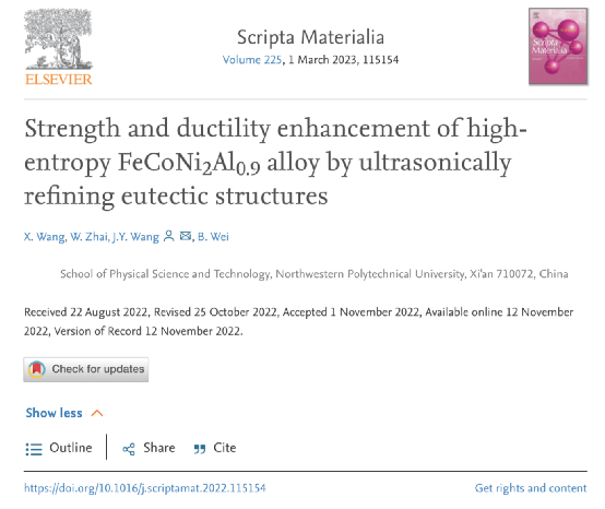 材料顶刊《Scripta Materialia》:通过超声细化共晶结构增强高熵铁合金的强度和延展性