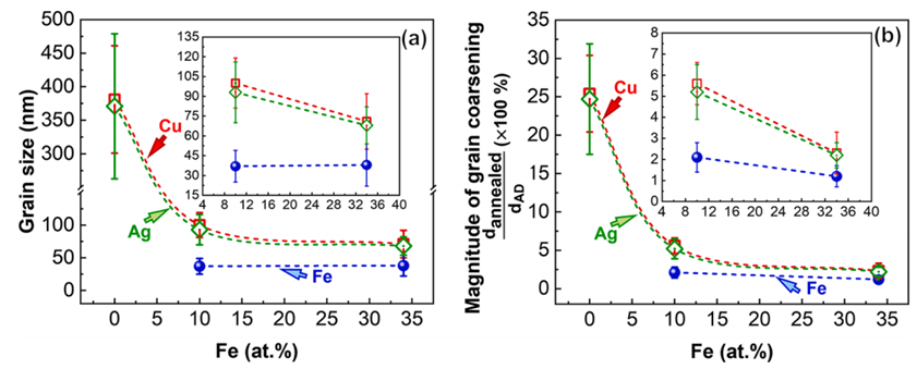 纳米结构金属因其高强度、优异的辐射耐受性和耐磨性而引起了广泛的研究兴趣。然而,纳米结构金属因高温下界面多余自由能最小化导致其微观结构不稳定,在高温下的应用在很大程度上受到阻碍。热稳定性差表现为高温性能的退化,如晶粒粗化导致的快速软化。从动力学和热力学角度提出了各种晶粒稳定策略。已有研究表明,第二相粒子的加入可诱发齐纳钉住效应,减缓晶粒生长。同时,溶质可以通过晶界偏析来拖动界面运动或降低晶界能。