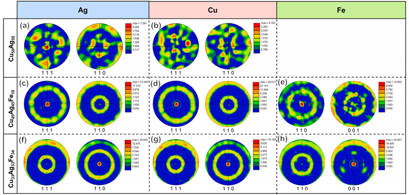 图8(a-b)600℃退火合金中的{111}和极图(PFs)呈随机极分布。(c-d){111}和{110} PFs和(f) {110}和{100} PFs,表明其具有强烈的{111}Cu、Ag//{110}Fe纤维结构。(f-g){111}和{110} PFs以及(h) {110}和Fe的Cu、Ag//{100}Fe纤维结构明显。