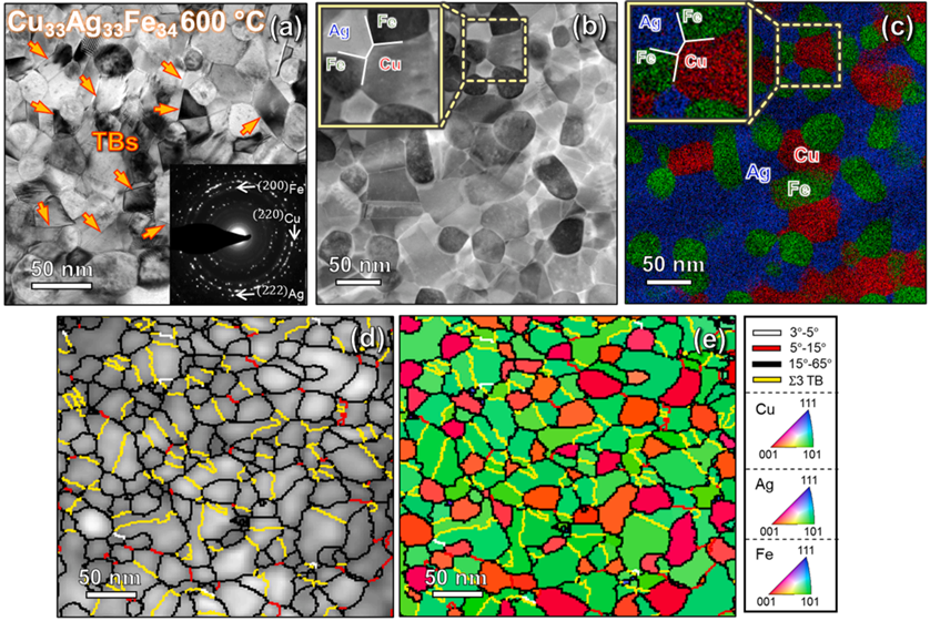 图6在600℃ (a) PV TEM图像下退火的CAF34合金的显微结构和插入的SAD图案显示了多晶结构。(b-c)HAADF STEM显微图和相应的EDS图,显示了Cu、Ag和Fe的相分离。黄色虚线框放大了Cu、Ag、铁颗粒形成三相三结的典型区域。(d) GB特征图叠加在VDF图像上。(e) IPF显示出明显的Cu/Ag(110)纹理和明显的Fe(100)纹理。