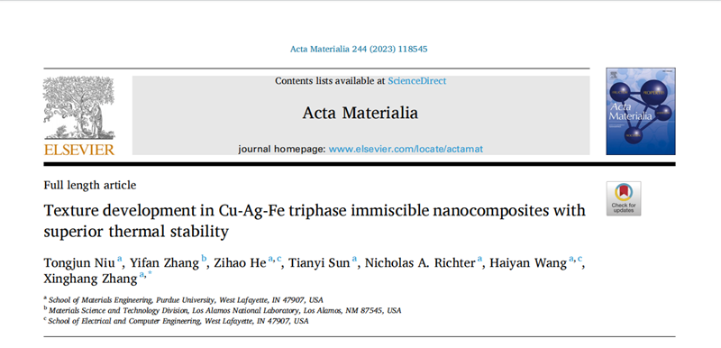 在此,美国普渡大学材料工程学院张兴航教授团队研究了织构形成和演化背后的基本机制。报道了与CuAg二元合金相比,Cu-Ag-Fe三相不混溶纳米复合材料(TPINs)的热稳定性增强。Cu-Ag-Fe中细晶粒的稳定源于动力学势垒的引入和低能态界面的优先形成。同时,沿Ag/Fe和Cu/ Fe界面观察到曲率依赖的取向关系。改变铁含量引起的织构演化是通过表面能和应变能的竞争而发生的。为不混溶纳米复合材料中利用相边界和三结稳定纳米颗粒提供了一种可行的方法。相关研究成果以题“Texture development in Cu-Ag-Fe triphase immiscible nanocomposites with superior thermal stability”发表在金属顶刊Acta Materialia上。