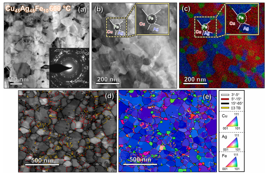 图4在600℃. (a) PV TEM图像下退火的CAF10合金的显微结构和插入的选择区域衍射(SAD)模式显示了多晶的性质。(b-c)HAADF STEM显微图和相应的EDS图,显示了Cu(红色)、Ag(蓝色)和Fe(绿色)的元素分布。插图显示了球形铁颗粒在铜和银颗粒的四个交点处的成核。(d) GB地图叠加在VDF图像上。(e) IPF显示出明显的Cu/Ag(111)纹理和Fe(110)纹理。