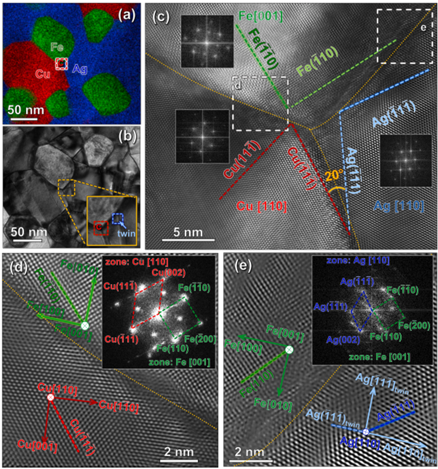 图9(a-b)在600c下退火的CAF34合金的EDS图和相应的PV TEM显微图。红色虚线框勾画了一个具有代表性的Cu-Ag-Fe三相三结。铜银铁三结的(c) HRTEM显微图。Fe沿[001]区轴定向,而Cu和Ag沿[110]区轴进行检测,如图所示。其取向关系分别为:(110)Fe//(111)Cu)、(110)Fe//(111)Ag。Cu与Ag的错取向角约为20(d)Cu/Fe界面放大HRTEM显微图表明[100]Fe与[110]Cu平行。(e)放大的Ag/Fe边界显示平行的[100]Fe和[110] Ag孪晶。插图取自图6b中蓝色虚线框勾画出的区域,揭示了孪生区域的原子排列。