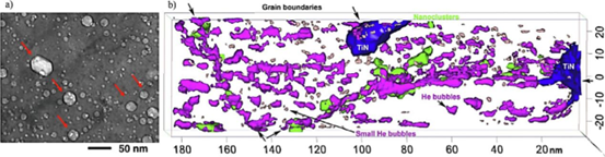 图2 a)双离子辐照(60 dpa) RAF钢的TEM图像,显示辐照产生的氦气形成的空腔(用红色箭头表示)。b)在750°C退火100 h后,He注入14YWT ODS钢的APT测量的体积重建。