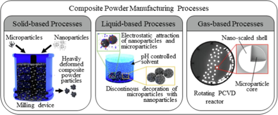图6 复合粉末制造技术的分类包括以机械合金化(MA)工艺为代表的一种固体基复合粉末制造工艺,以静电沉积(ED)工艺为代表的一种液基复合粉末制造工艺,以及以PCVD (PVD)工艺为代表的一种气基复合粉末制造工艺。